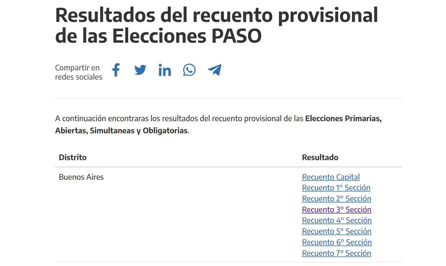 Para consultar los datos de las PASO debemos acceder al portal del Estado Nacional donde se encuentra publicado el recuento provisorio: https://www.argentina.gob.ar/elecciones/resultados-del-recuento-provisional-de-las-elecciones-paso. Aquí encontraremos los resultados de las elecciones por provincia (y sección para el caso de Buenos Aires).