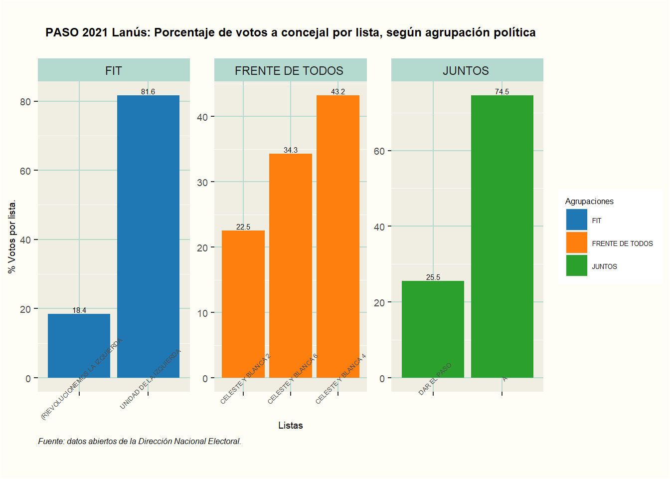 ggtitle("PASO 2021 Lanús: Porcentaje de votos a concejal por lista, según agrupación política") +
