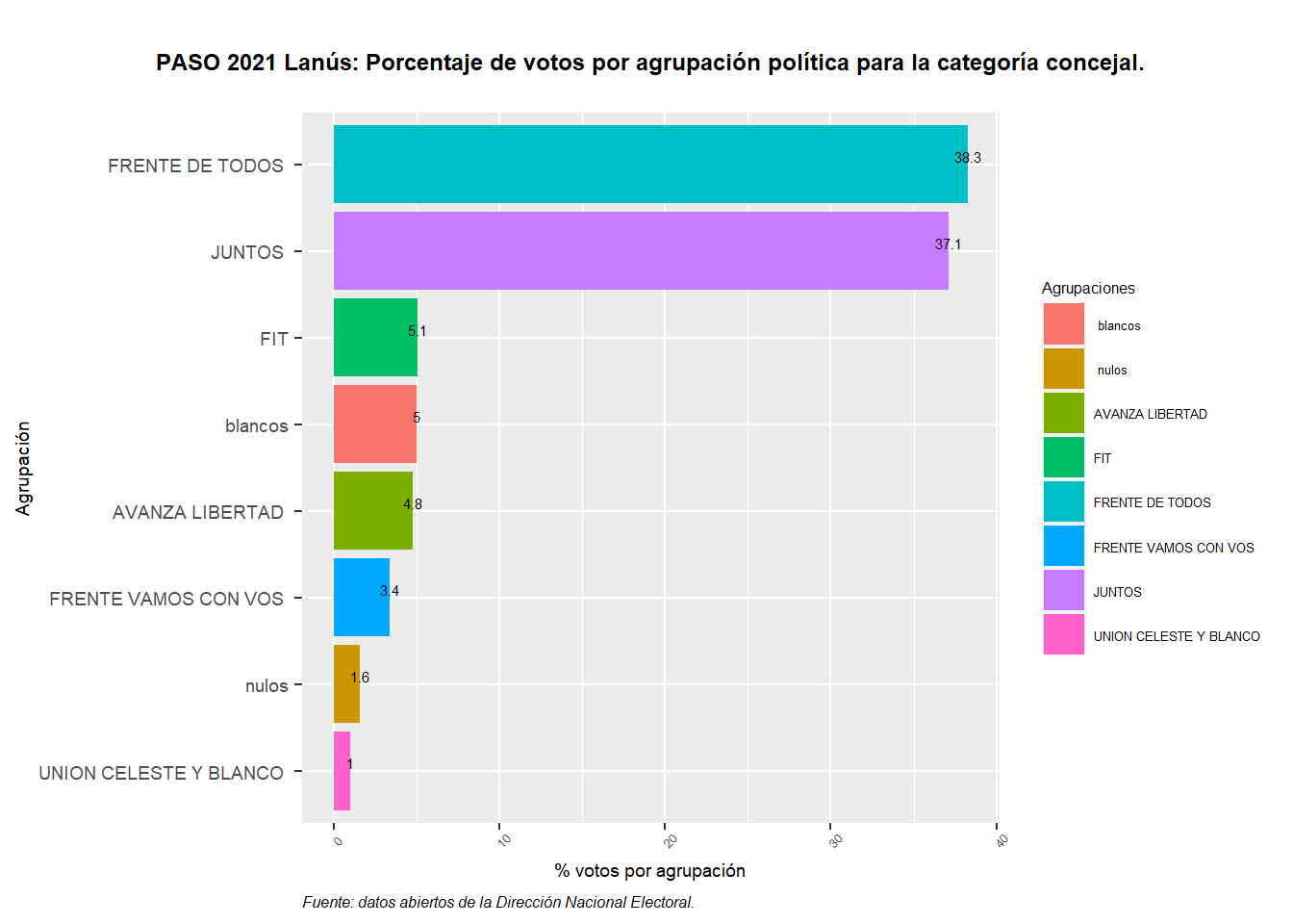 ggtitle("PASO 2021 Lanús: Porcentaje de votos por agrupación política para la categoría concejal.") +