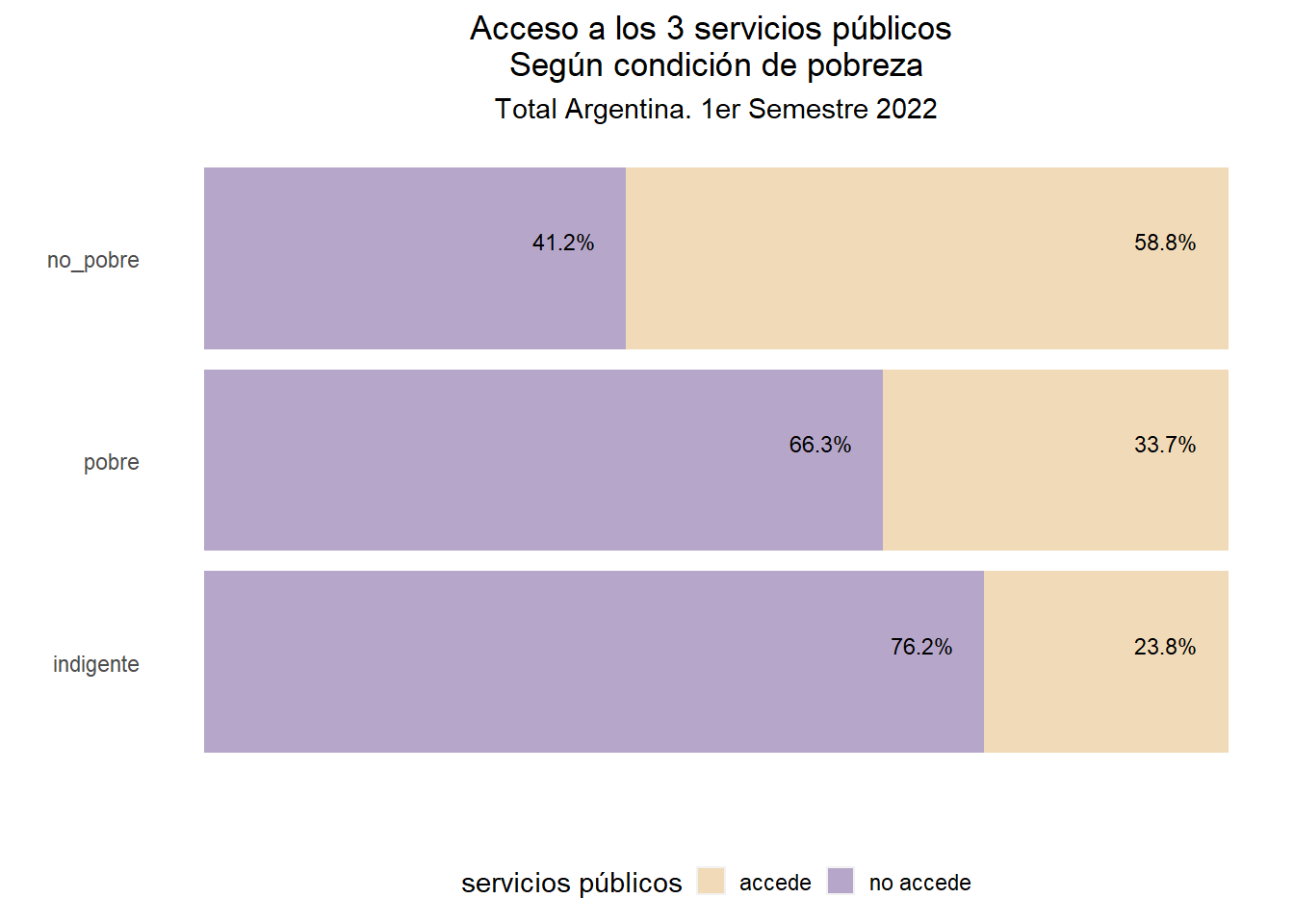 Lo que está marcando está imagen es que más de un tercio de compatriotas, hombres, mujeres y niños, viven en situación de pobreza, y que, en términos de tendencia, esta circunstancia se ve acompañada por mayores privaciones en materia de hábitat y acceso pleno a servicios públicos con respecto a aquellos que no son pobres. Esto es un problema importante que requiere acciones sostenidas por parte del gobierno y la sociedad en su conjunto para abordar las causas subyacentes de la pobreza y garantizar que todos los ciudadanos tengan acceso a los servicios y recursos necesarios para llevar adelante una vida digna.