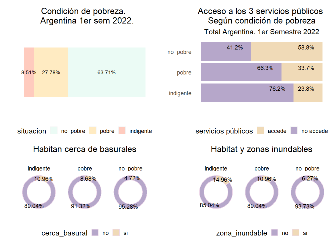 Habida cuenta del ejercicio iniciático de este documento, llevaremos adelante el cálculo y visualización de 3 variables relacionadas con las condiciones de vida en Argentina, creando resúmenes generales y gráficos por condición de pobreza (tener presente el gráfico de INDEC que compartimos al inicio).